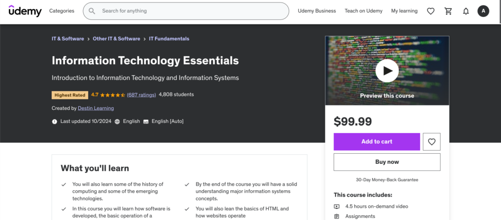 | Udemy — Information Technology Essentials — Best for Database Management | $99.99 | ✓ No prerequisites required
