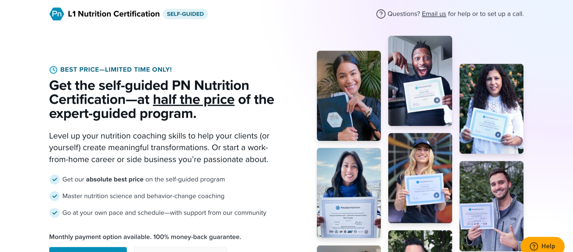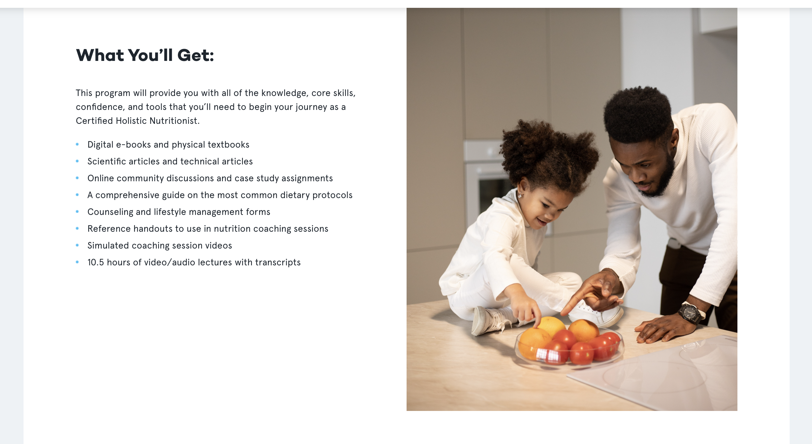 PN’s nutrition certification differs from other programs on our list in that it focuses on teaching a particular health and wellness coaching method. While the program is open to students of all backgrounds, it’s designed for individuals who want to create or grow a coaching business. This may mean the program is not suitable for all students, especially those more interested in learning about nutrition from a personal health standpoint.