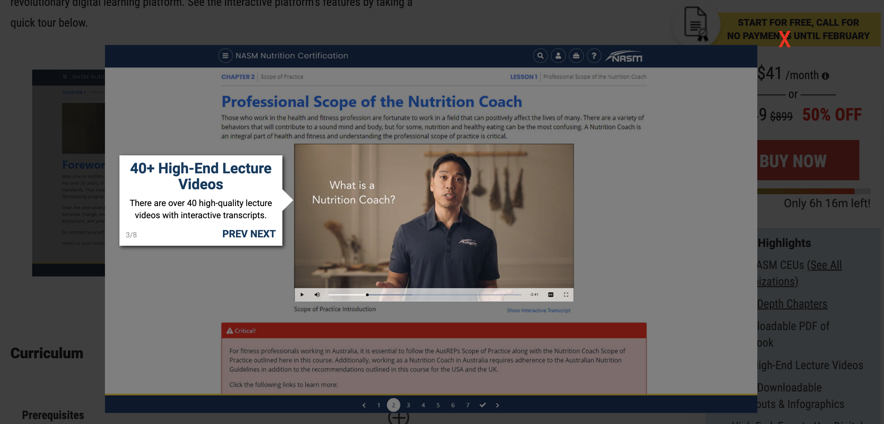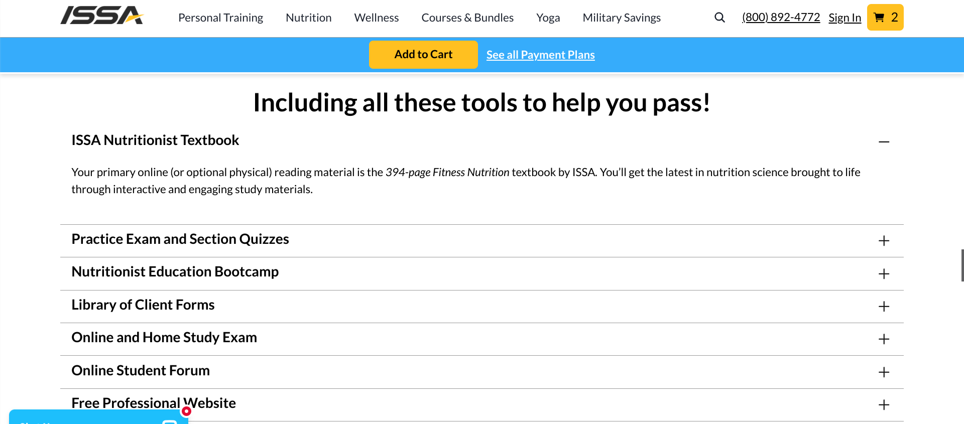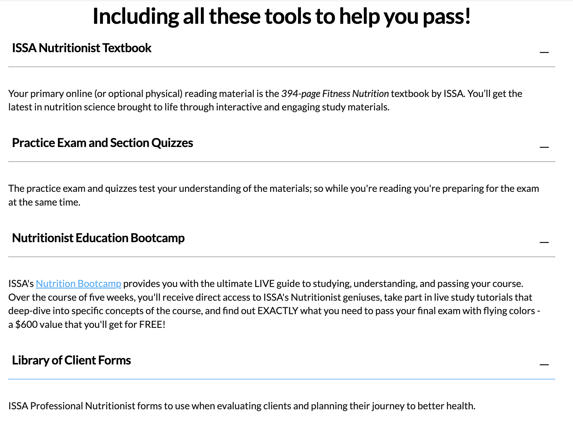 For a relatively affordable price, students are provided with a plethora of resources, including ISSA’s textbook, either in digital or print format, a practice exam, quizzes, and a five-week bootcamp featuring live study tutorials and access to ISSA’s expert nutritionist coaches.