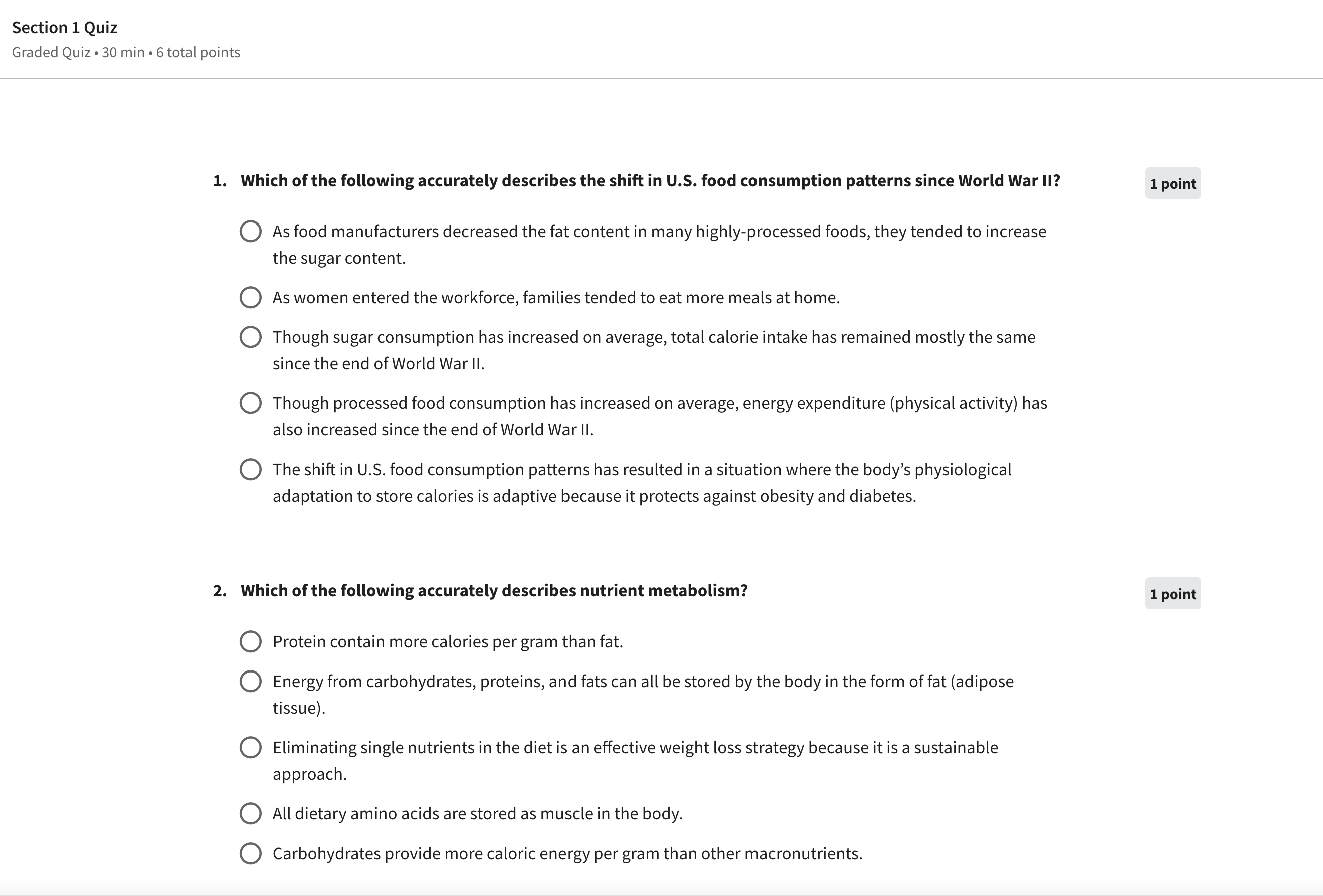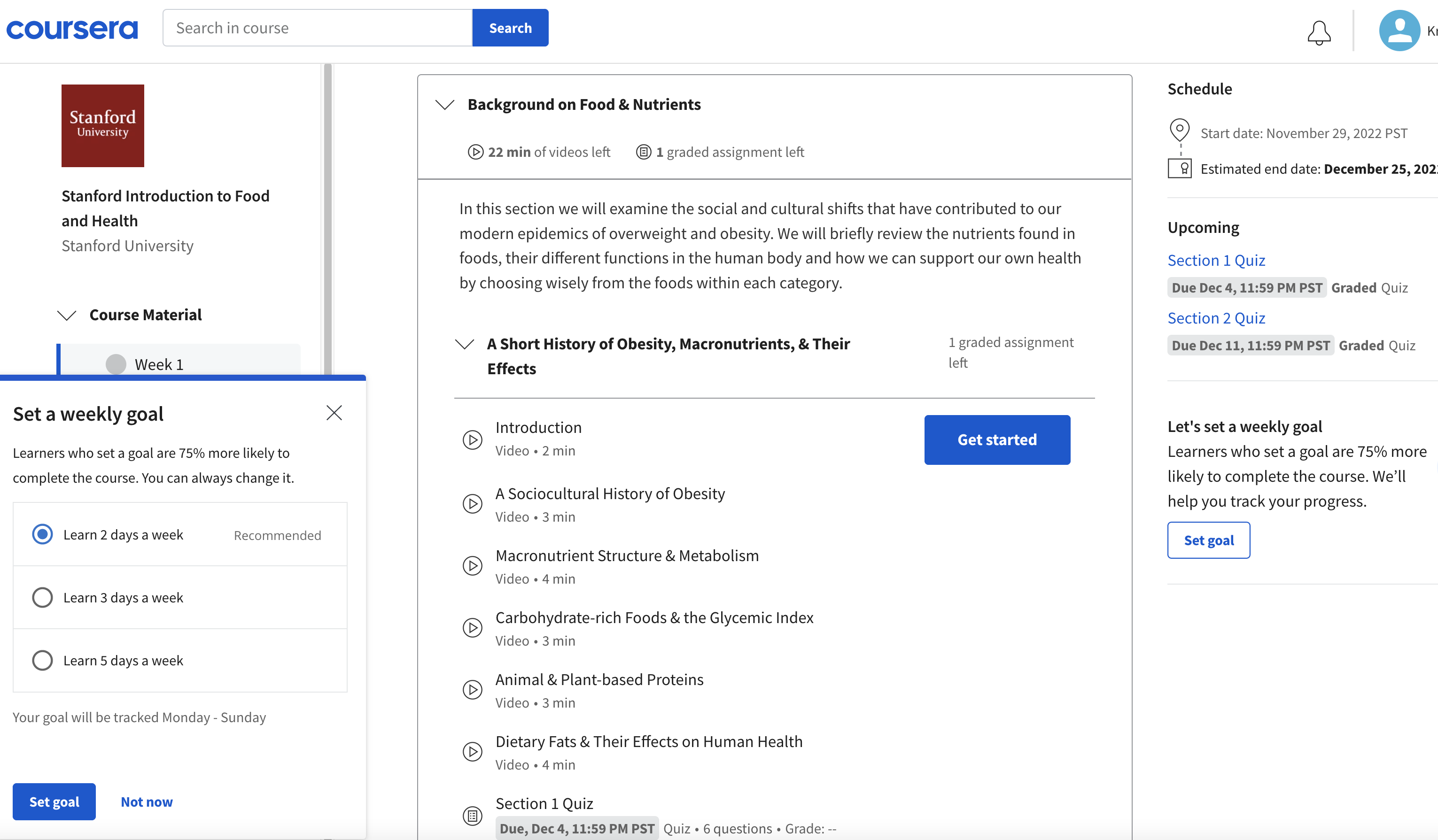 Depending on your level of nutrition knowledge, this course may be too simple for you. Individuals who choose this course because of the prestige of the Stanford name should know that the content and instruction style are geared towards a general audience and may be more simplistic than expected from a university course. Also, be aware that although students receive a certificate at the end of the course, it’s a completion certificate that doesn’t lead to professional credentials.