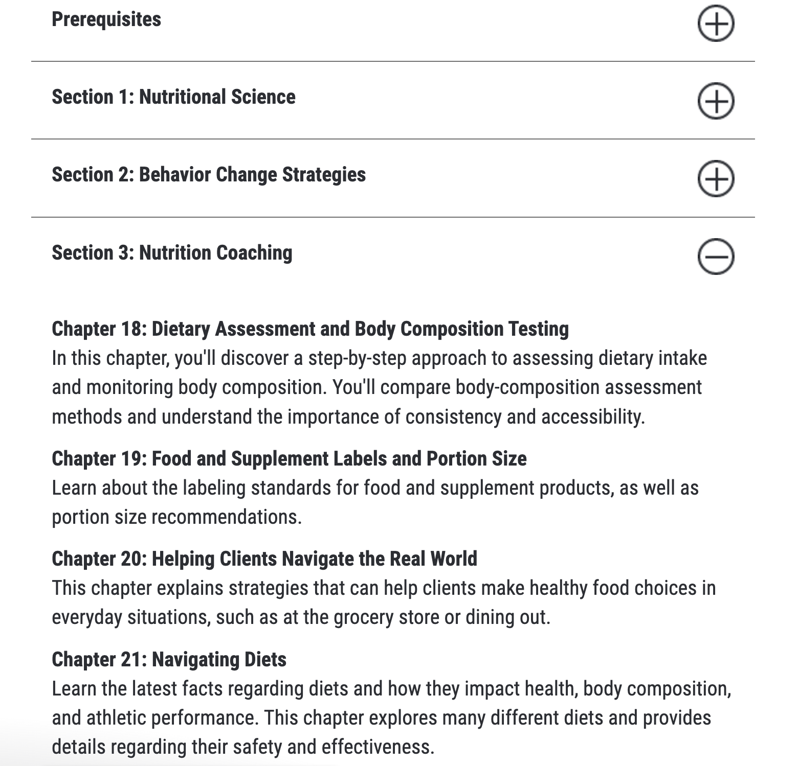 As with Precision Nutrition’s certificate program, students should be mindful that ISSA’s Nutritionist Certification is as much about professional development as a health and wellness coach as it is about nutrition. Students don’t need to have a specific background in coaching to enroll in the program. Still, if they are seeking nutrition and food science education for personal information purposes, this course contains information that may not be relevant to them.