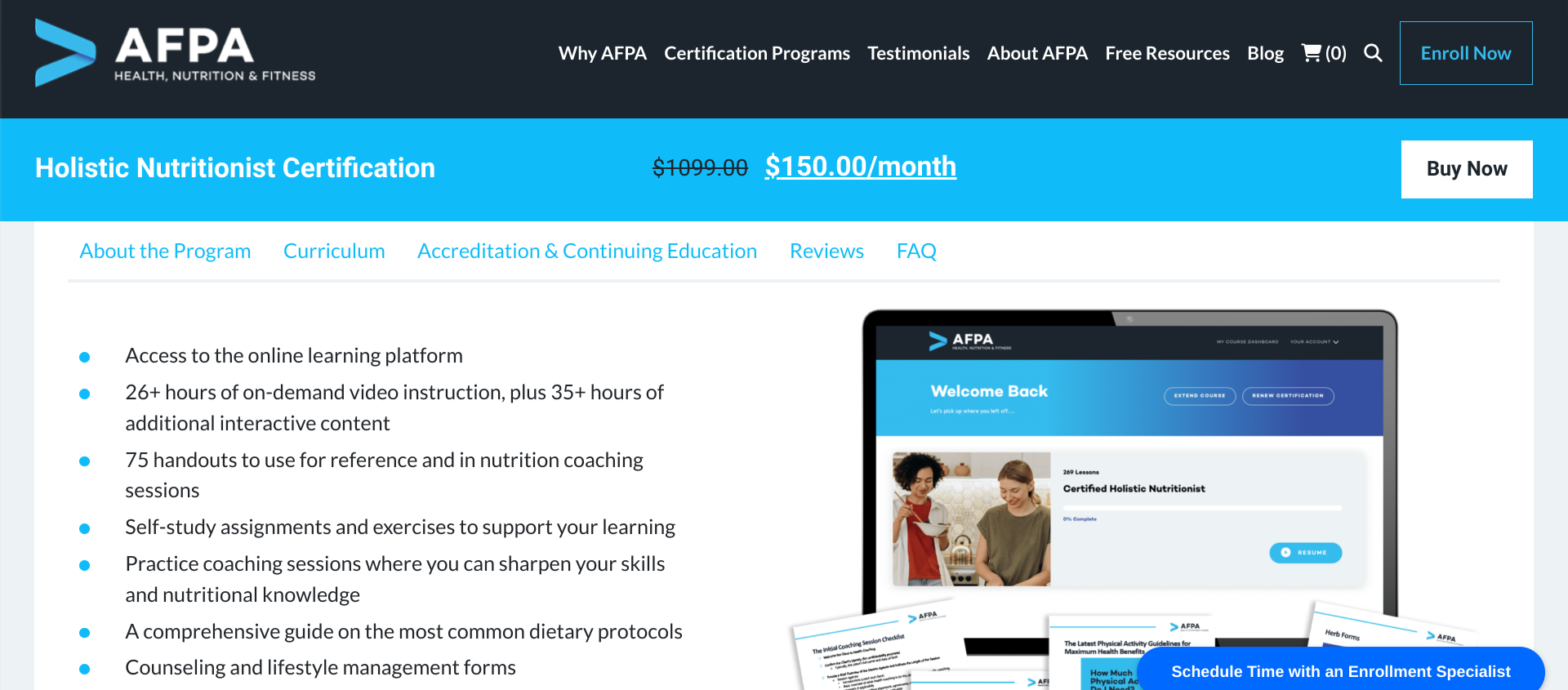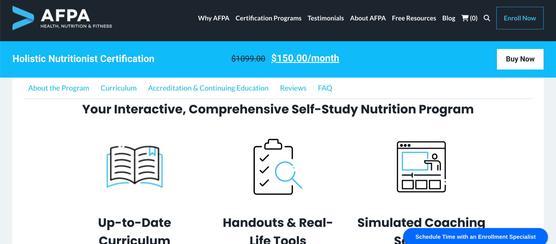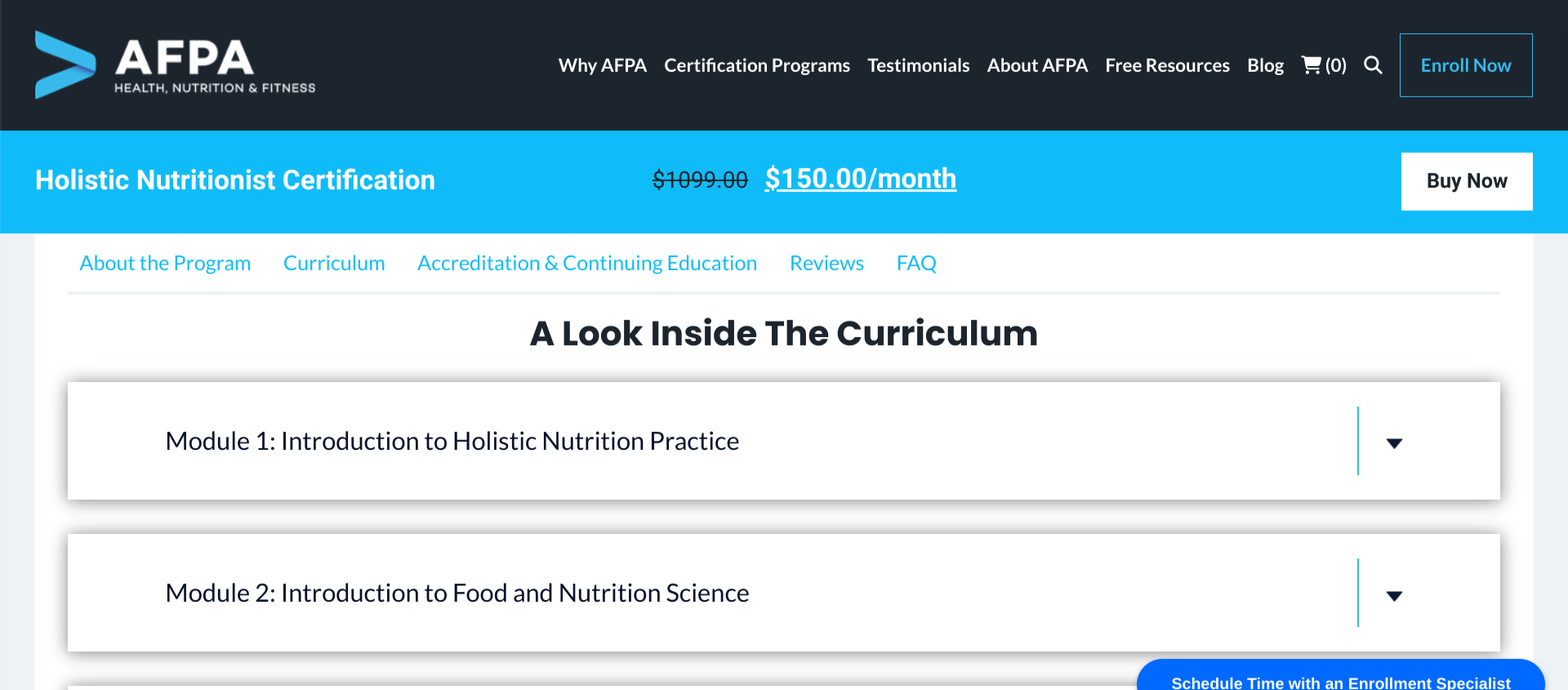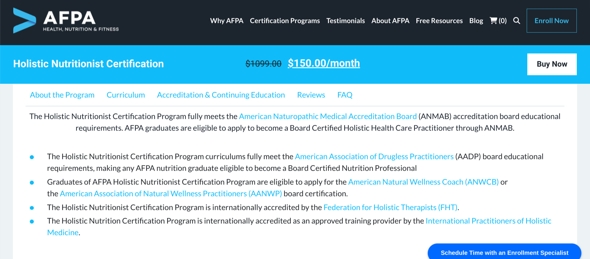One key drawback of AFPA’s Holistic Nutrition certification program is that its self-paced, asynchronous design gives students little opportunity for interaction with instructors. The organization has “education specialists” available to help with questions and concerns, including any technical issues. However, students looking for a more personalized learning experience may not find what they want in this program. Also, if students need to extend their six-month subscription, there’s an additional $75 charge.