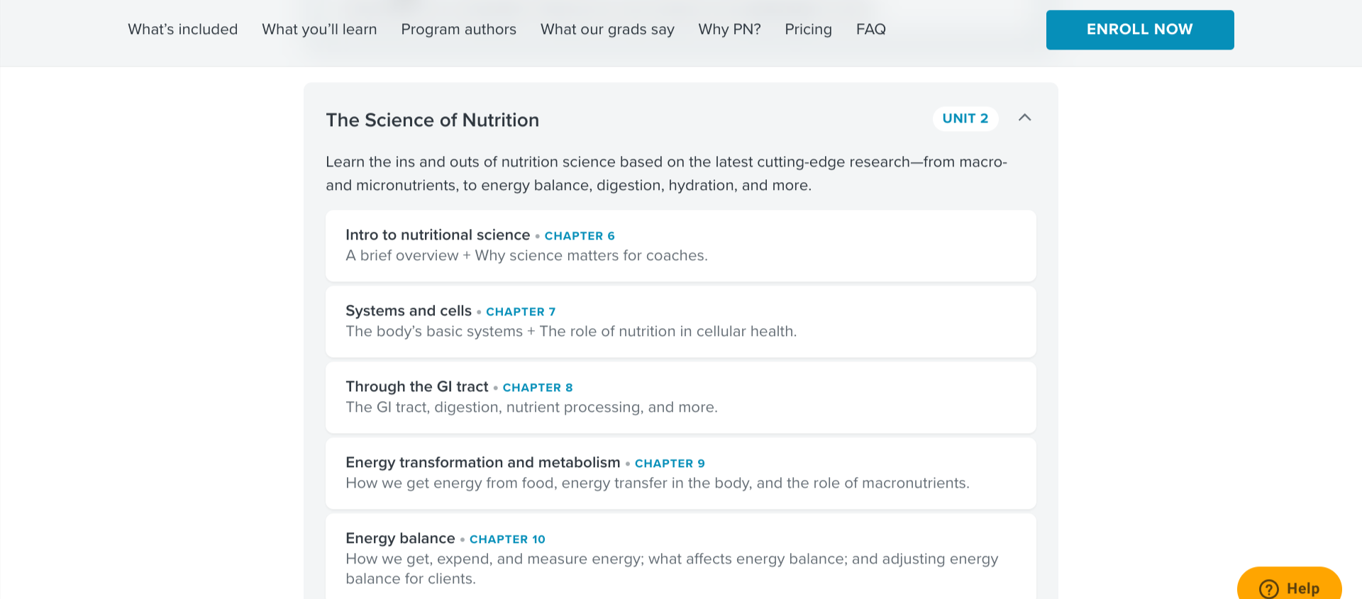 Like many online nutrition certifications on our list, PN’s Level 1 Nutrition Coaching Certification offers a comprehensive curriculum that covers basics like micro- and macronutrients, metabolism, energy balance, and more.
