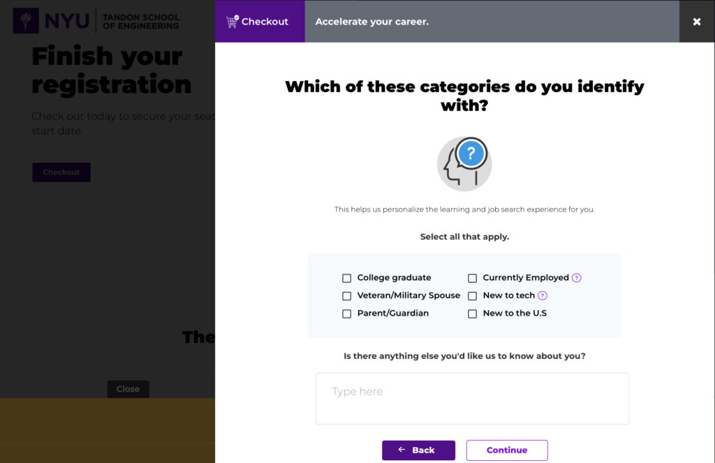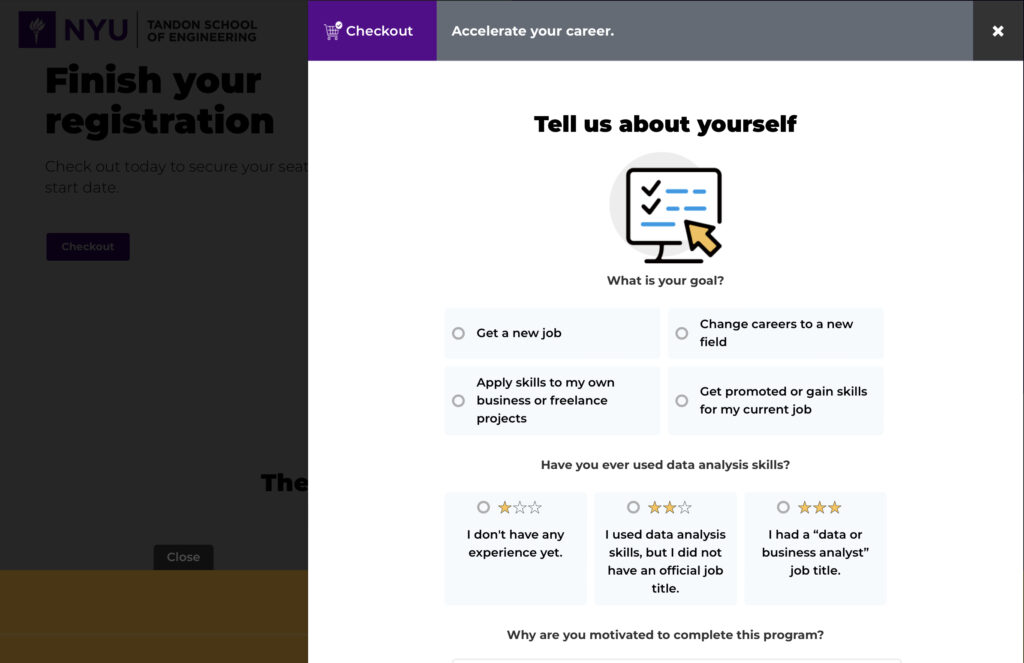 Udacity creates a customized experience for students by having them complete a short questionnaire upon registering, which the platform uses to recommend courses to help students meet their goals.