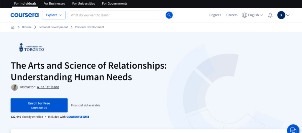 | Coursera — The Arts and Science of Relationships: Understanding Human Needs — Best for Social Workers | Free or $49 with a certificate | ✓ No prerequisites required