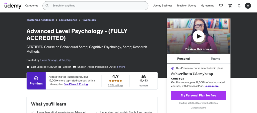 - Udemy — Advanced Level Psychology Certificate — Best Professional Outcomes