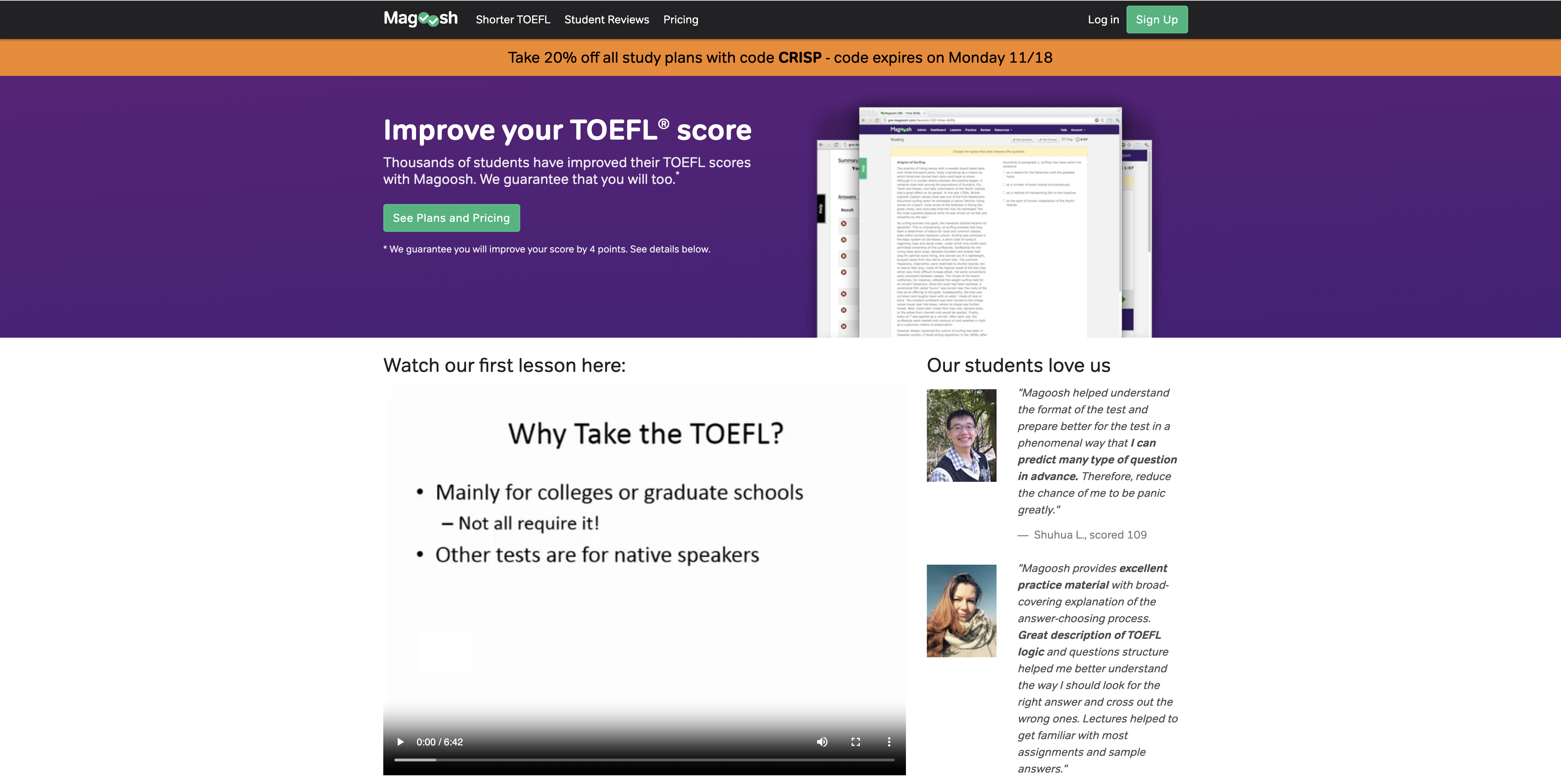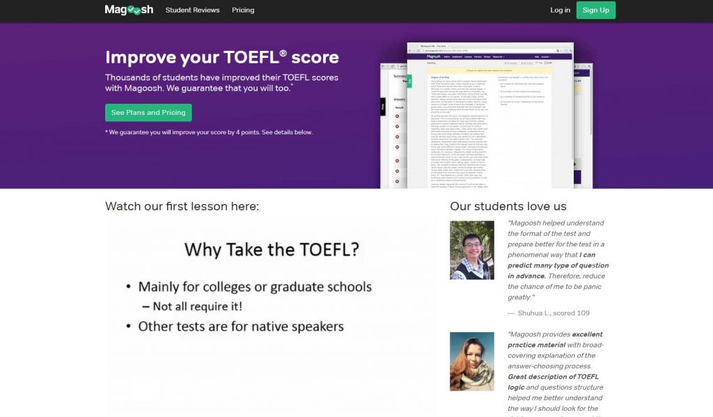 Magoosh stands out as our top pick for TOEFL test prep, checking all the boxes for quality, flexibility, and effectiveness. With the most extensive video lesson library and question bank available, Magoosh provides comprehensive resources to cover every aspect of the test. As a student, you’ll also benefit from access to TOEFL experts, ensuring support whenever needed. Additionally, the program goes beyond standard prep with a score improvement guarantee and an abundance of mock exams, helping students track their progress and boost their confidence ahead of test day.