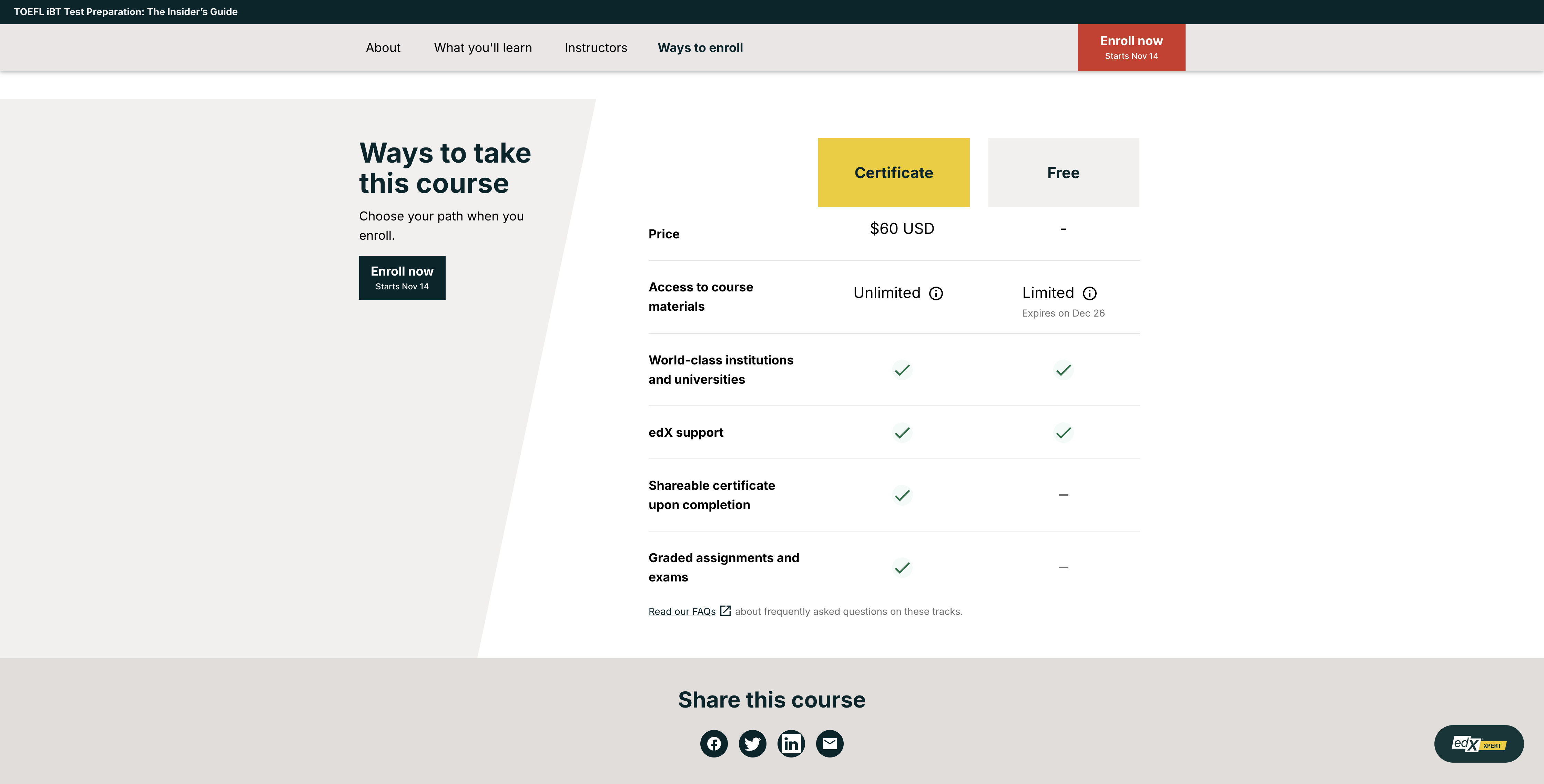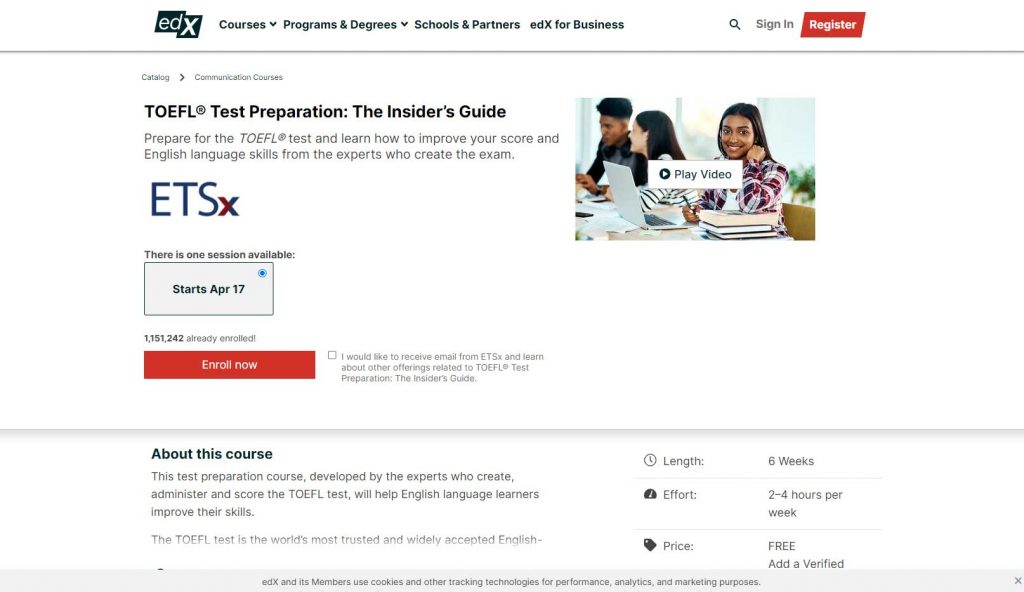 ETSx offers a robust TOEFL prep experience with a budget-conscious approach. You can access the course for free before committing to the paid certificate package, making it accessible to explore test prep options without an immediate investment.