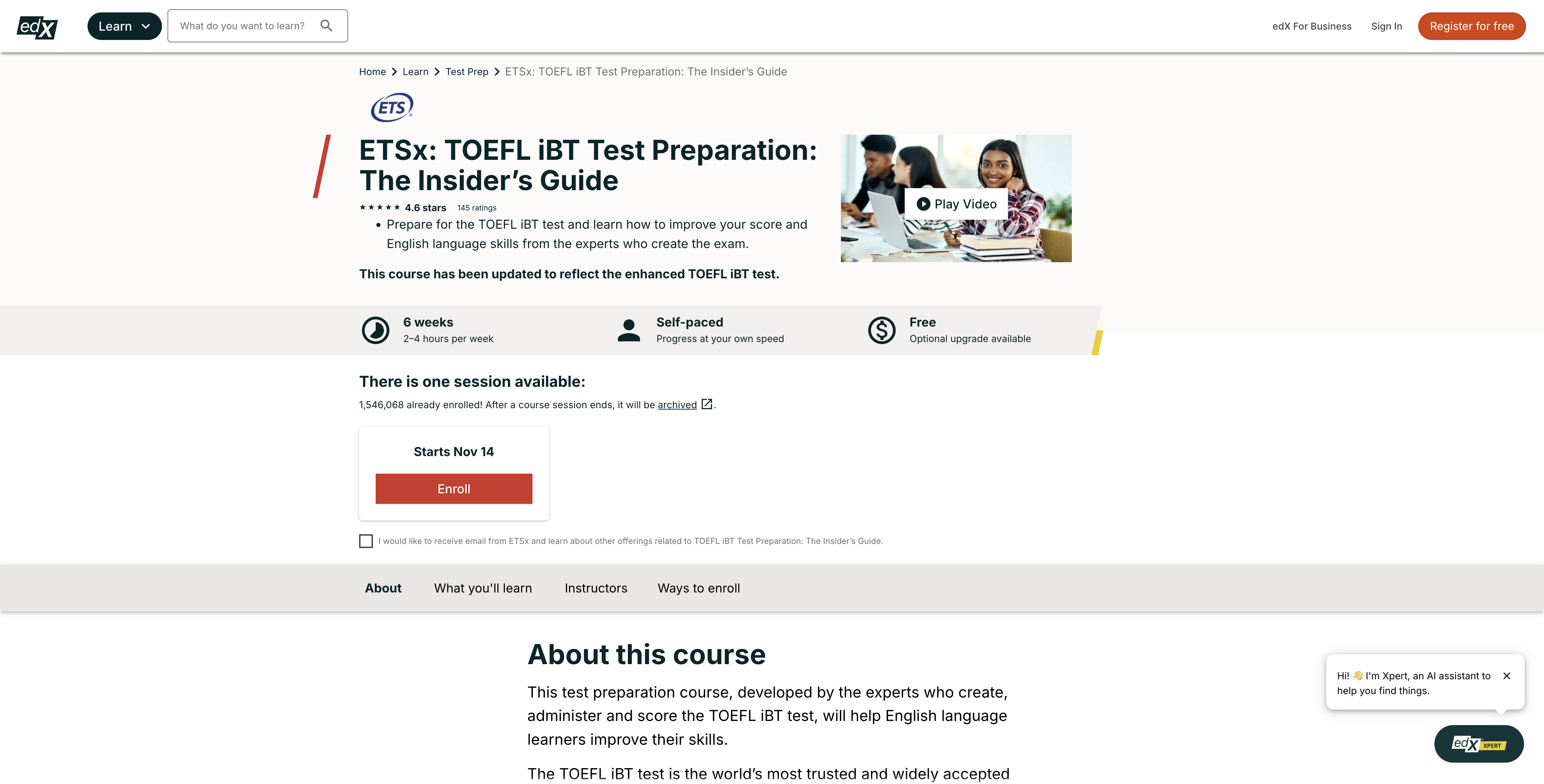 ETSx offers an entirely free TOEFL test prep course that can be completed in six weeks, with an optional upgrade available for additional access.
