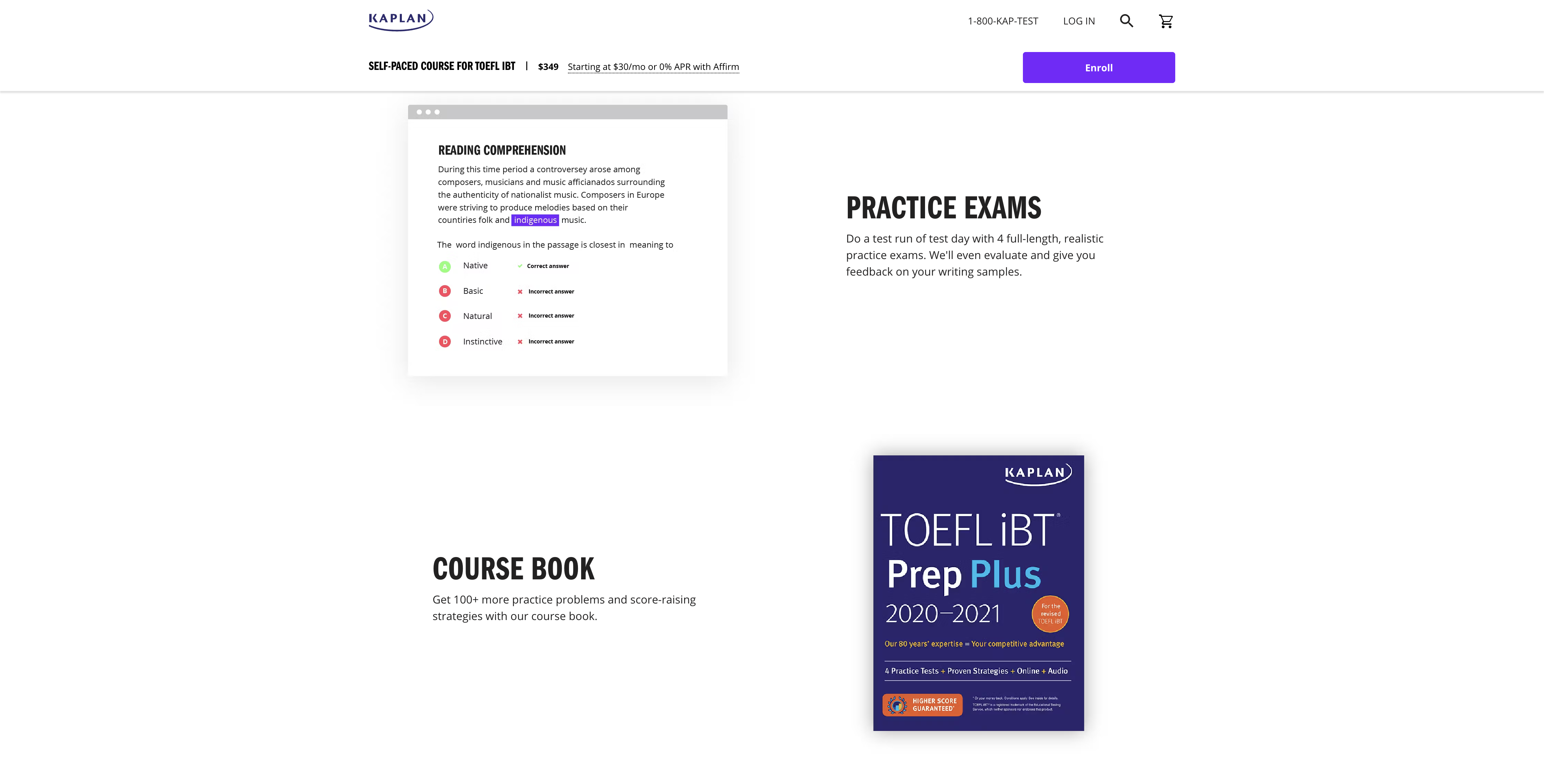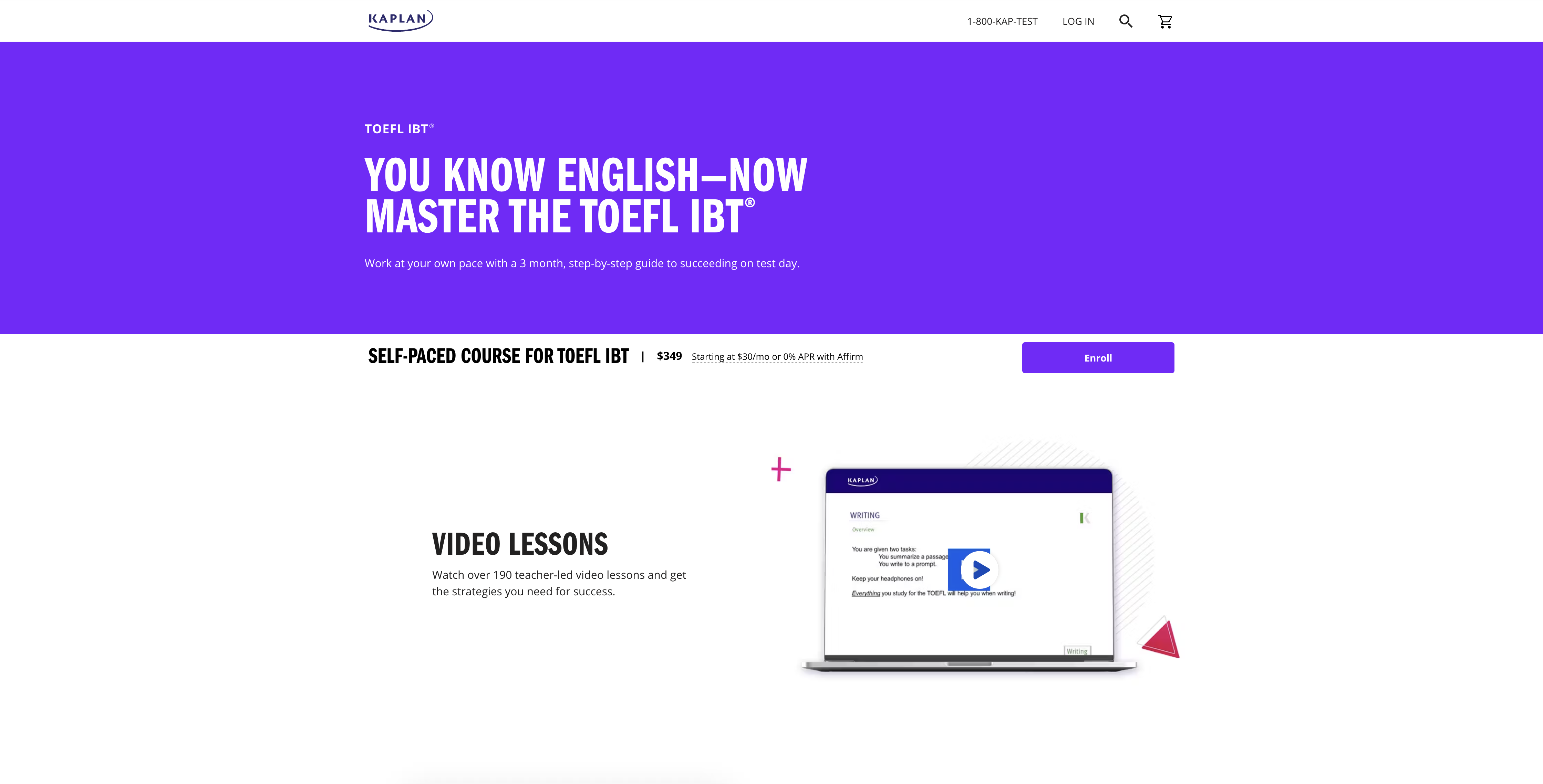 Besides a library of comprehensive video lessons, students also gain access to four full-length practice exams and the official Kaplan TOEFL Prep Plus course book.