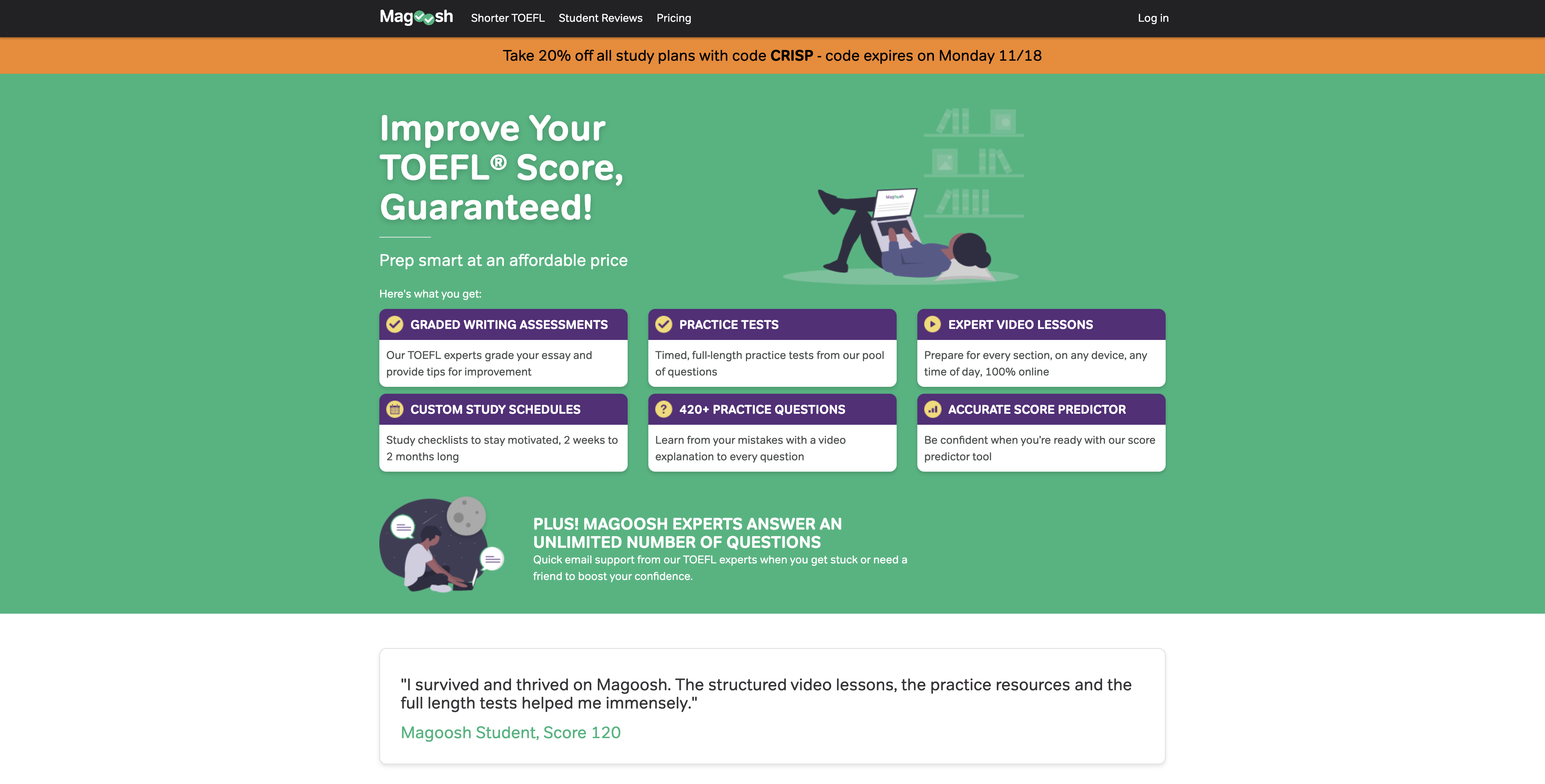Magoosh provides a robust set of resources, including over 420 practice questions, each with its video explanation to reinforce understanding. With more than 140 lesson videos, it covers every essential concept needed to excel on the TOEFL, providing well-rounded, in-depth preparation.