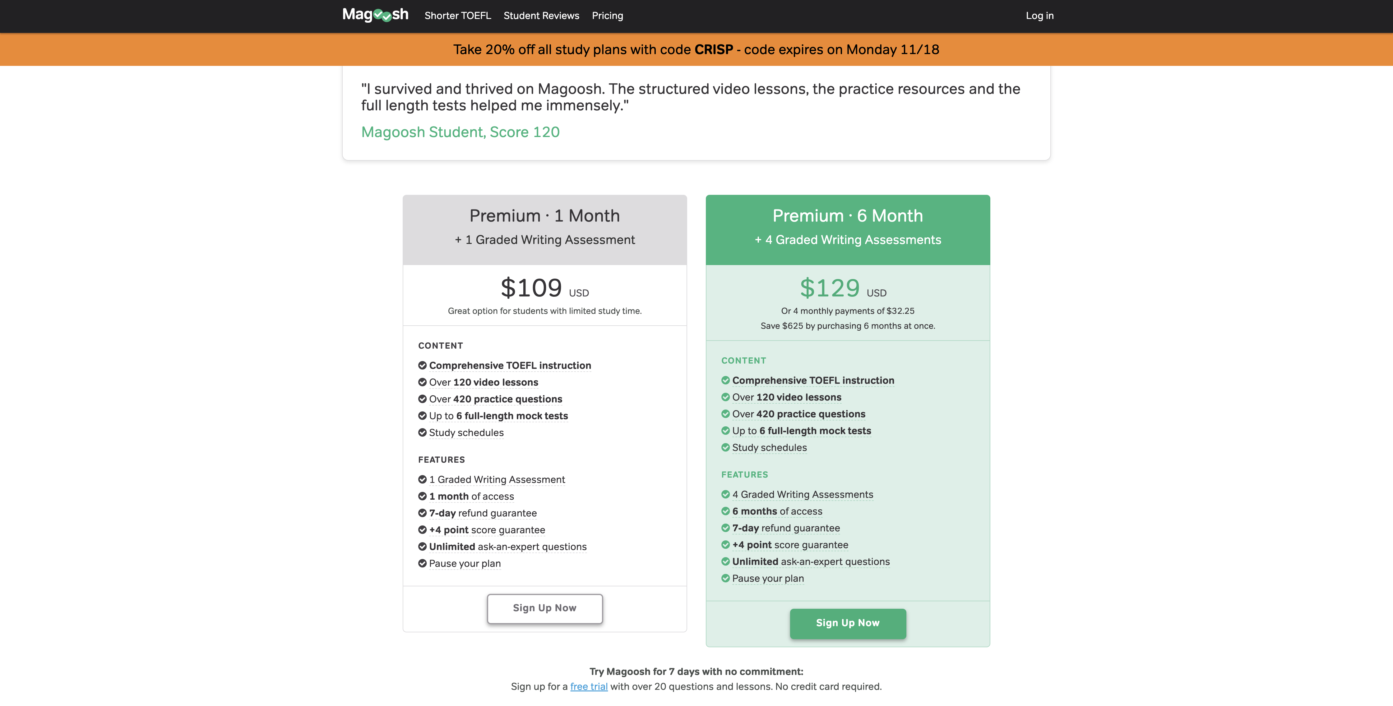 While Magoosh offers an array of resources, one drawback is its score guarantee, which applies only to students retaking the TOEFL and excludes first-time test-takers. This policy may be disappointing for those new to the exam, as it doesn’t provide the added reassurance of a score guarantee that many other programs offer all users.