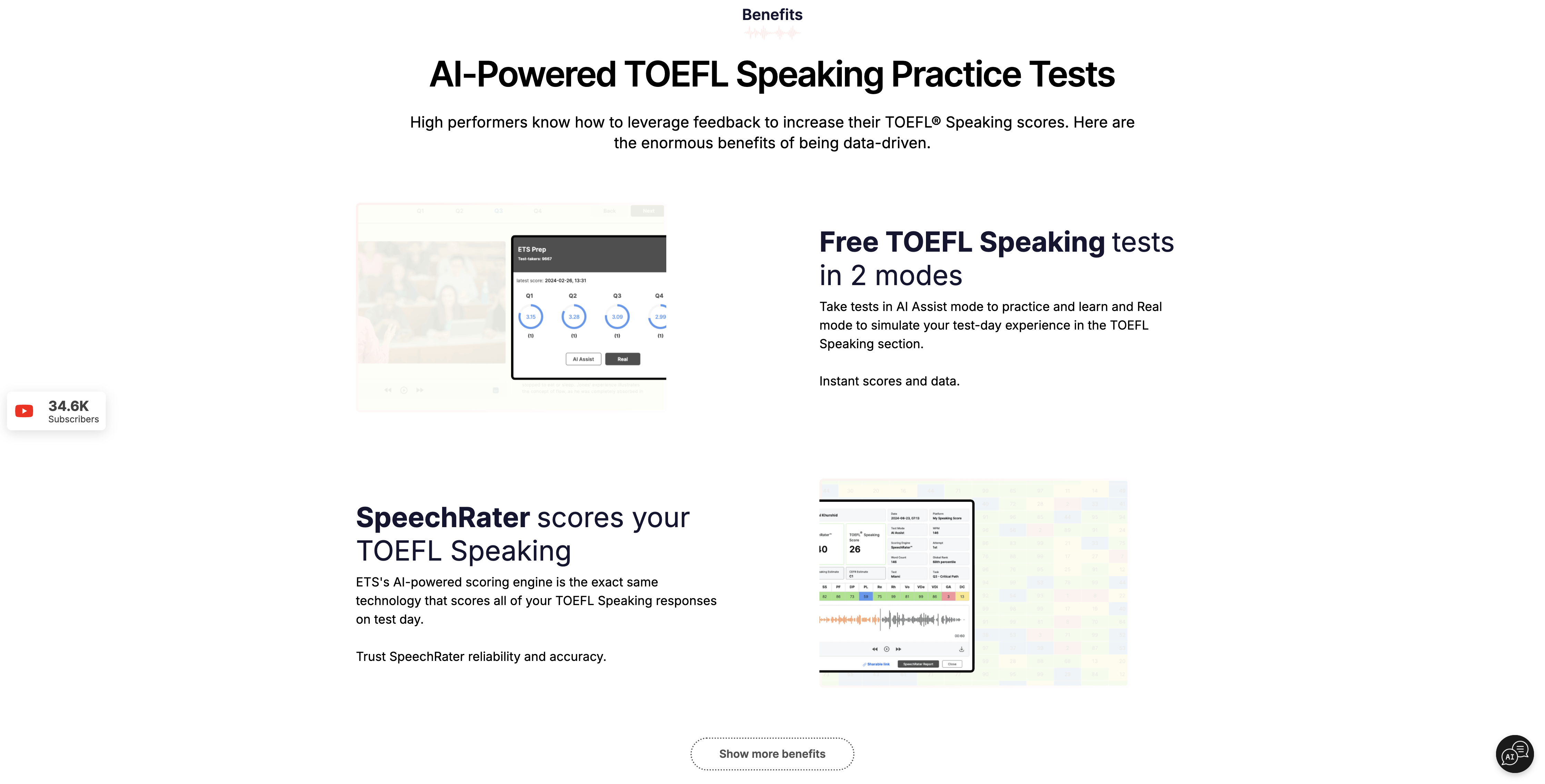 My Speaking Score is a highly specialized TOEFL prep service focused exclusively on improving speaking scores. Powered by AI, it offers targeted feedback on pronunciation, fluency, and coherence, making it ideal for anyone who needs additional support in this area. This service is an excellent fit for those who need help with the speaking section or who want to boost their speaking score significantly. It’s one of the most recommended options among test takers, praised for its precision and effectiveness in addressing speaking challenges.