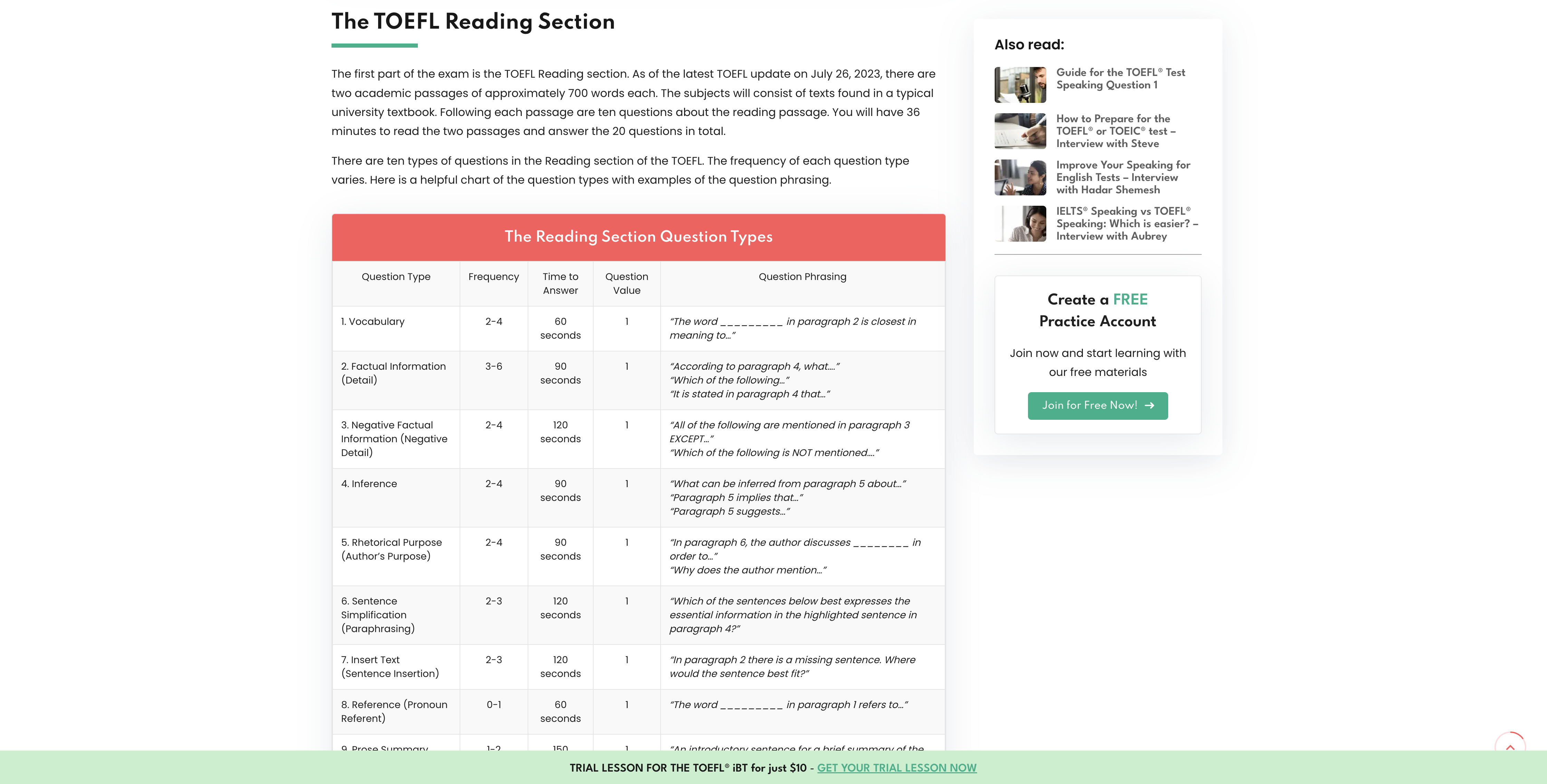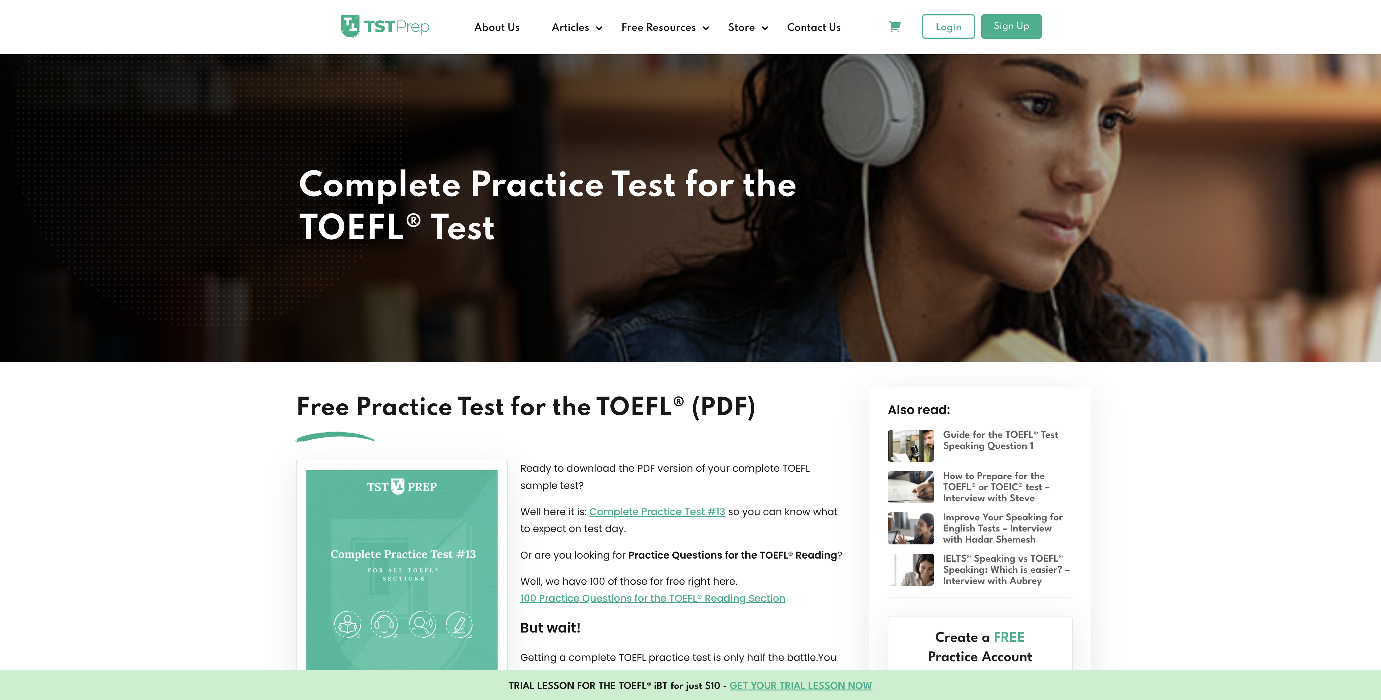 TSTPrep offers plenty of free resources for TOEFL test takers, including a free practice test with account creation.