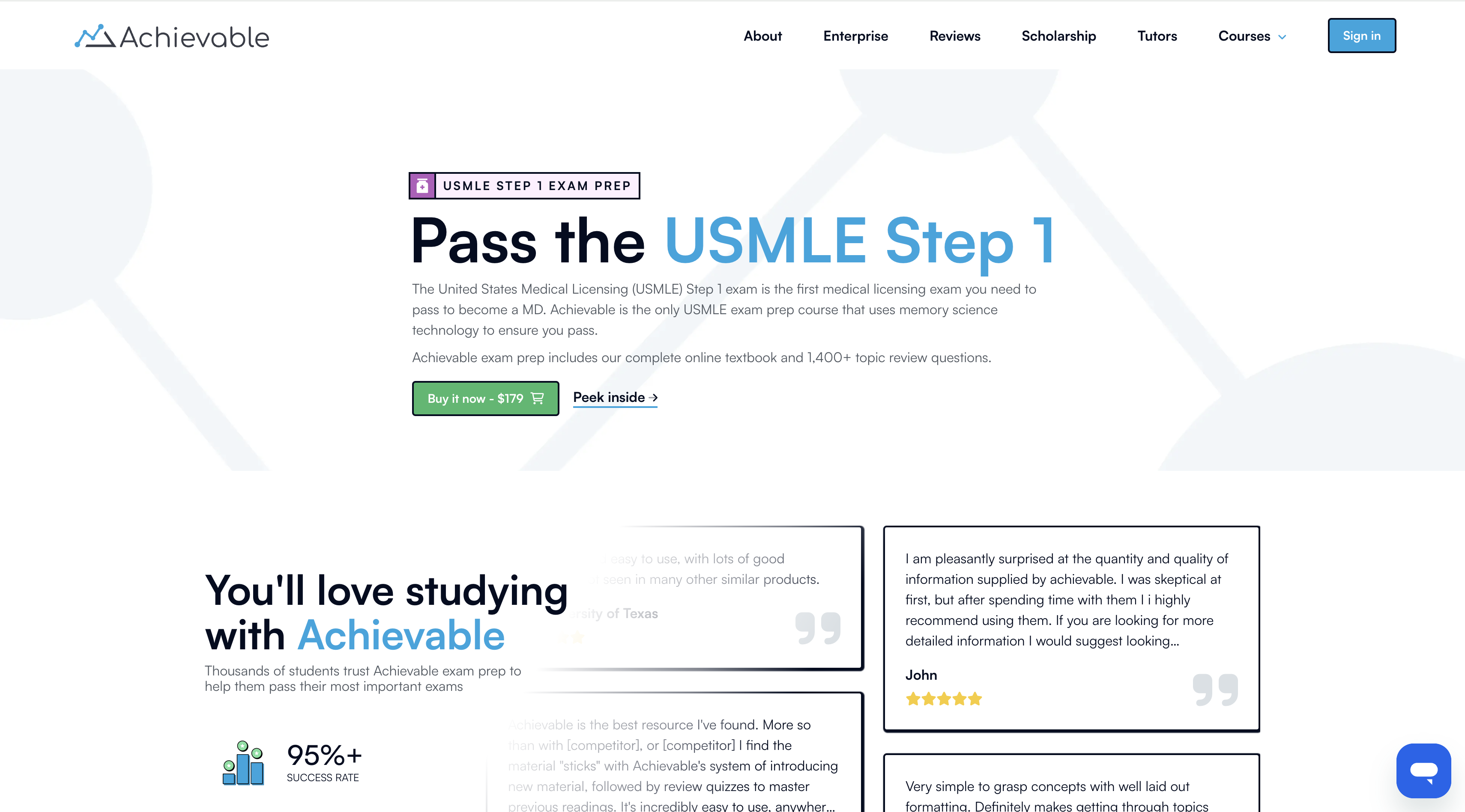 Given its newness, test takers have shared limited feedback on Acheivable’s USMLE prep. However, reviews for other exams praise the program’s universal format, highlighting comprehensive chapters paired with helpful quizzes. Students appreciate the structured approach and find it effective for mastering material.