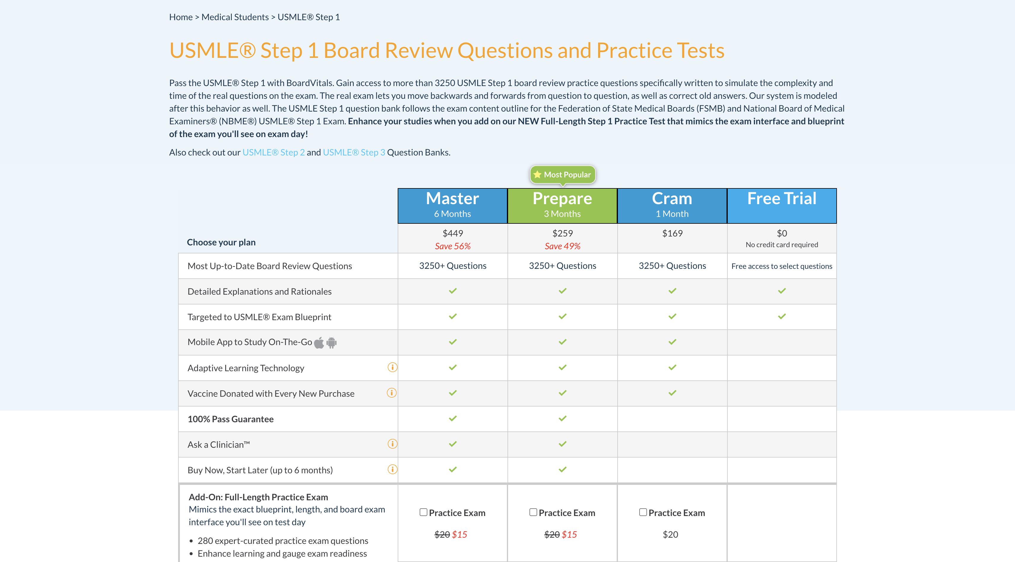 Price $169 – $449 (USMLE Step 1 Board Review Questions) Video Instruction N/A Live Class Hours None Practice Questions 3,250+ Practice Tests 1 practice exam can be added on for an extra $20 fee Content Access Period 1 – 6 months Mobile App Yes Guarantees Yes Free trial Yes |