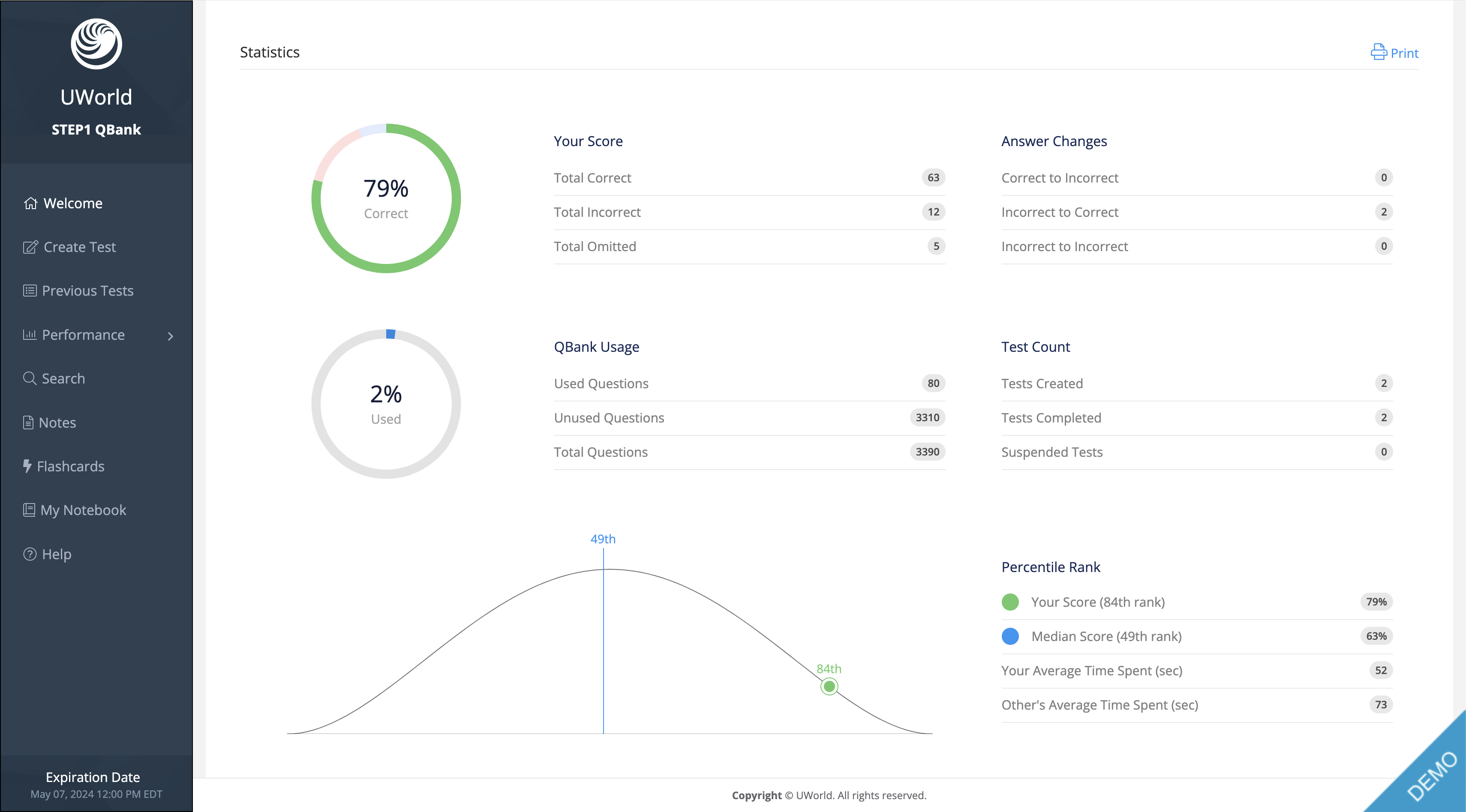 UWorld’s interface makes tracking your progress and percentile rank easy.