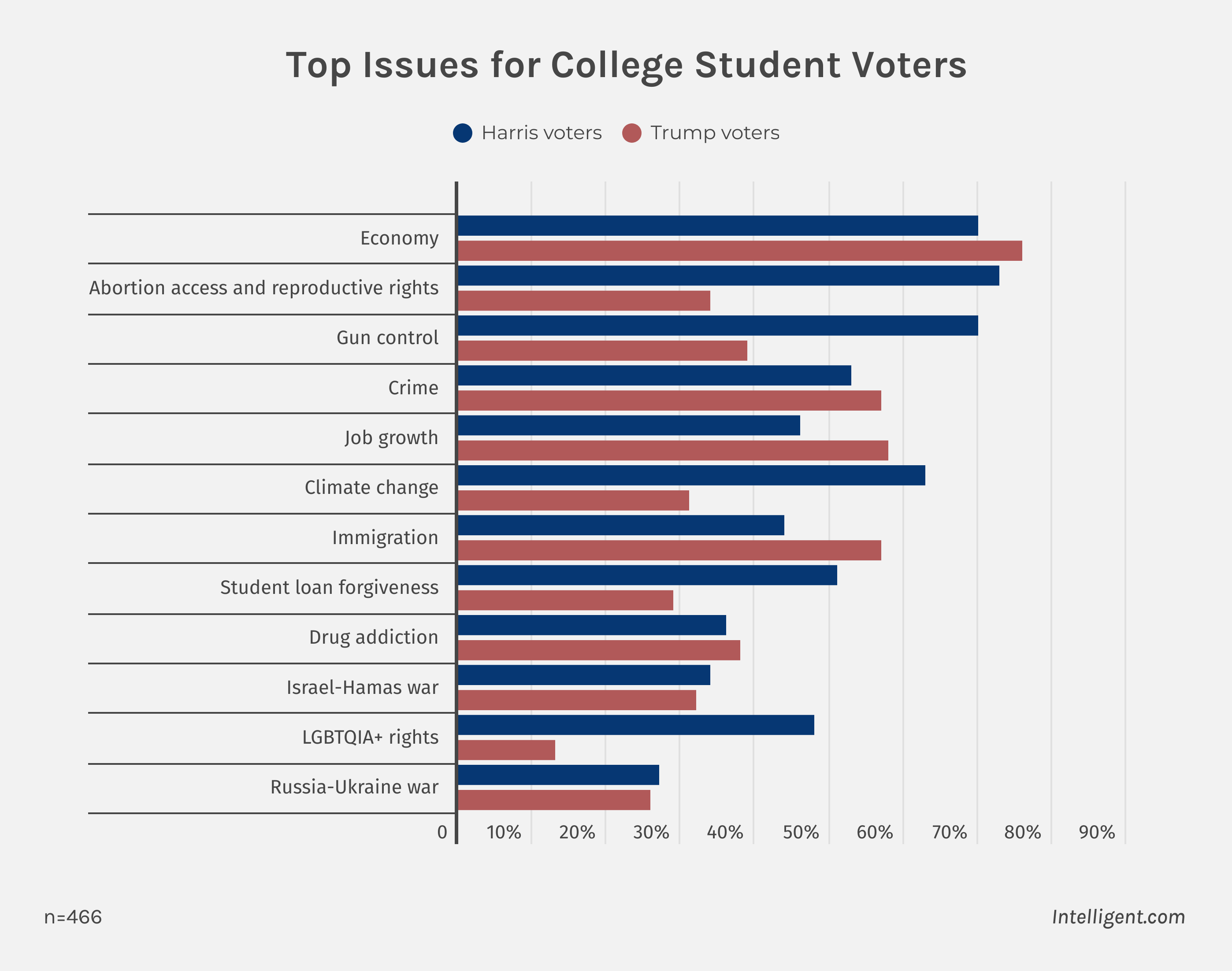 The issues most important to college student voters vary widely depending on their preferred candidate. The top issues for Harris voters include abortion access and reproductive rights (73%), the economy (70%), gun control (70%), climate change (63%), crime (53%), and student loan forgiveness (51%). Meanwhile, the top issues for Trump voters include the economy (76%), job growth (58%), immigration (57%), crime (57%), gun control (39%), and drug addiction (38%).