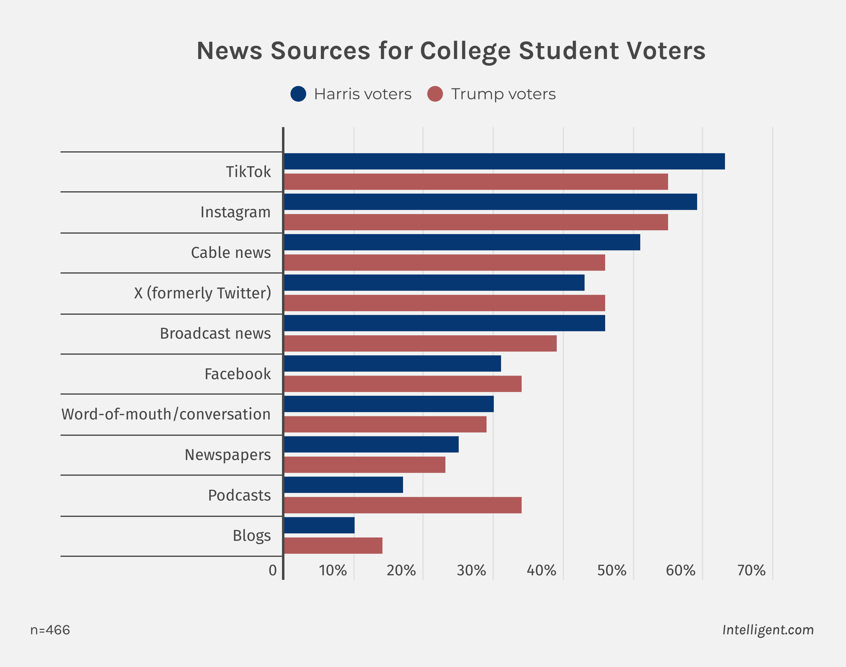 Among college students who voted for Trump, 34% reported getting their news from podcasts, compared to 17% of Harris voters. This figure rises to 39% among white male Trump voters. Additionally, 46% of Trump voters use X (formerly Twitter) for news, slightly higher than the 43% of Harris voters who do the same.